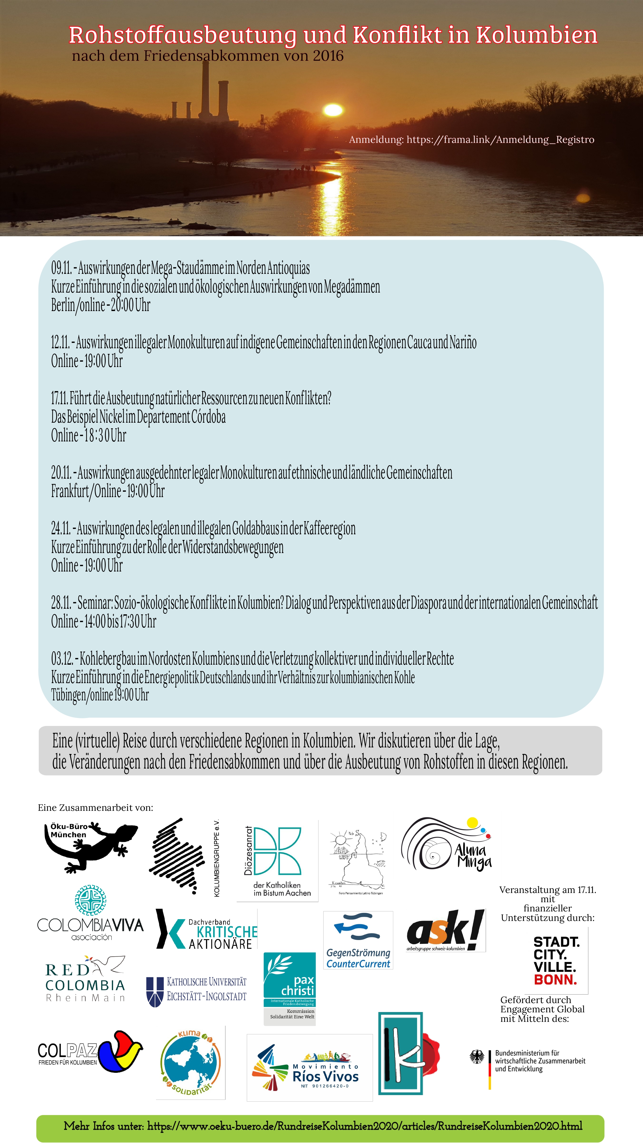 • (vom 9.11.2020 bis 3.12.2020) Rohstoffausbeutung und Konflikt in Kolumbien nach dem Friedensabkommen von 2016